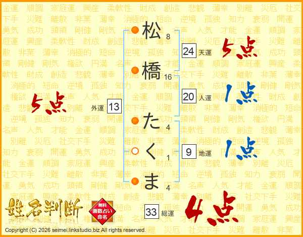 松橋たくまさんの総運は33画の4点!