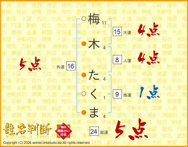 梅木たくまさんの総運は24画の5点!