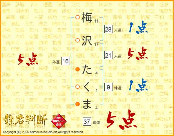 梅(11画)沢(17画) た(4画)く(1画)ま(4画)