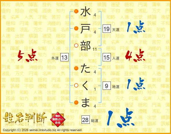 水戸部たくまさんの総運は28画の1点!