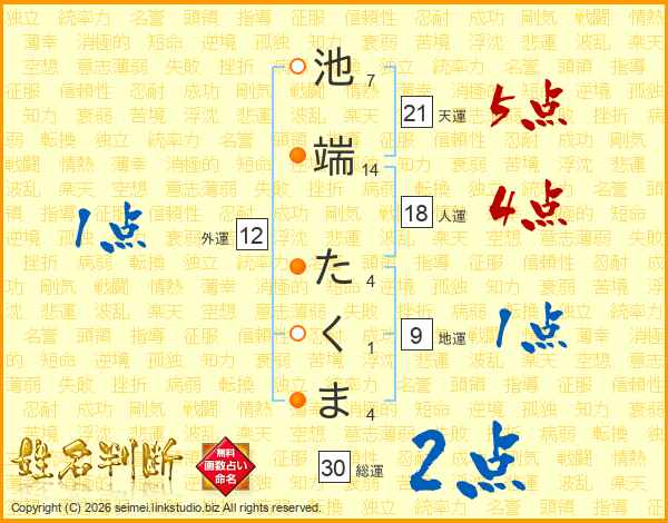 池(7画)端(14画) た(4画)く(1画)ま(4画)
