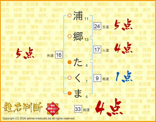 浦(11画)郷(13画) た(4画)く(1画)ま(4画)