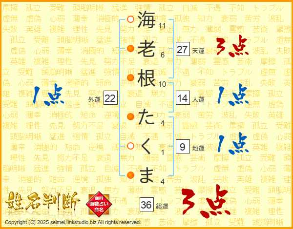 海(11画)老(6画)根(10画) た(4画)く(1画)ま(4画)