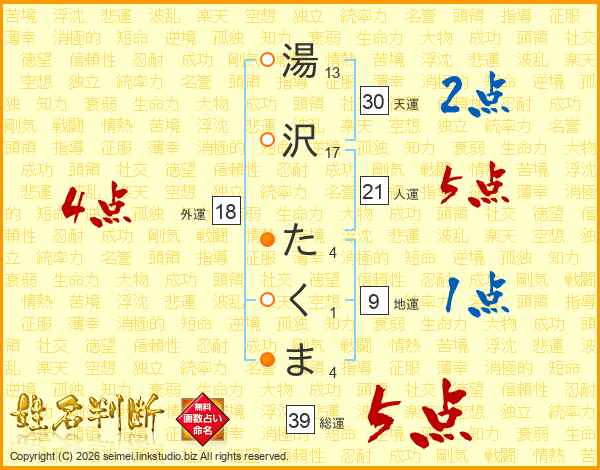 湯(13画)沢(17画) た(4画)く(1画)ま(4画)