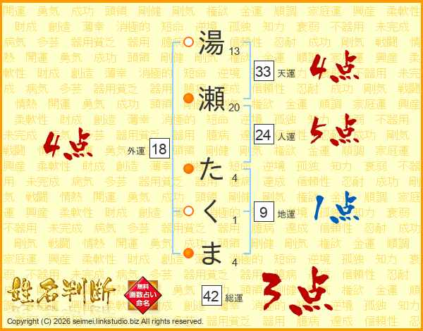 湯瀬たくまさんの天運は33画の4点!