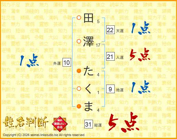 田澤たくまさんの総運は31画の5点!