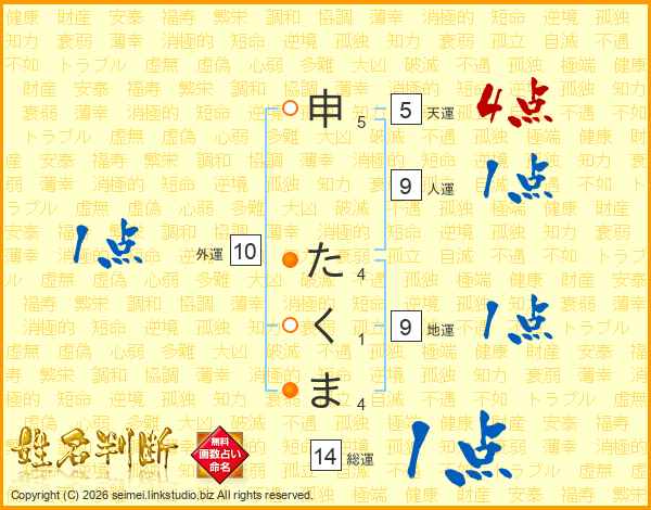 生活面を象徴する運勢です。外部から受ける影響力を表し、結婚運、家庭運や職場、環境への順応性を表します。総運から人運を引いた画数。姓や名が1文字の場合を除く。
