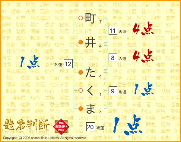 生活面を象徴する運勢です。外部から受ける影響力を表し、結婚運、家庭運や職場、環境への順応性を表します。総運から人運を引いた画数。姓や名が1文字の場合を除く。