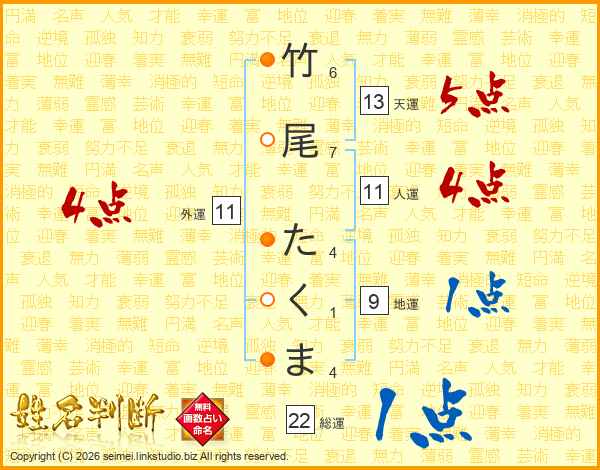 竹尾たくまさんの総運は22画の1点!