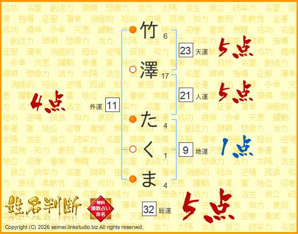 竹澤たくまさんの総運は32画の5点!