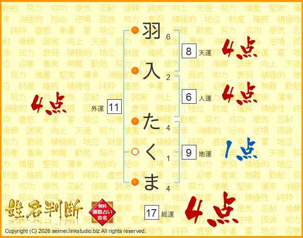 羽(6画)入(2画) た(4画)く(1画)ま(4画)