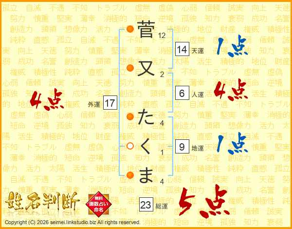菅(12画)又(2画) た(4画)く(1画)ま(4画)