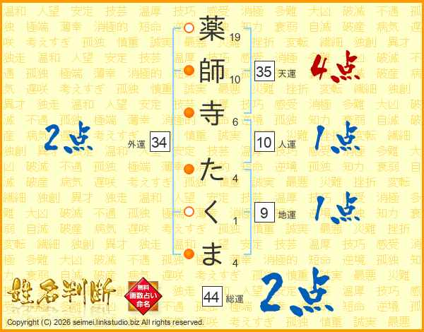 薬師寺たくまさんの総運は44画の2点!