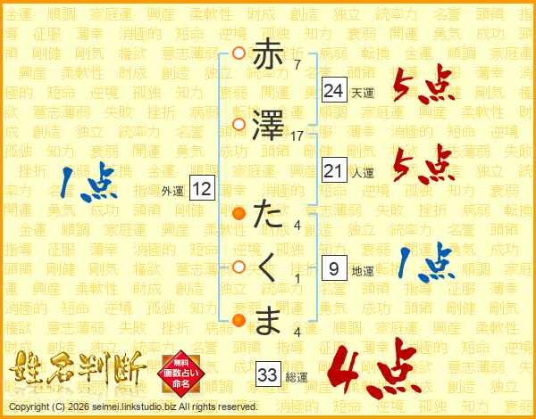 赤(7画)澤(17画) た(4画)く(1画)ま(4画)
