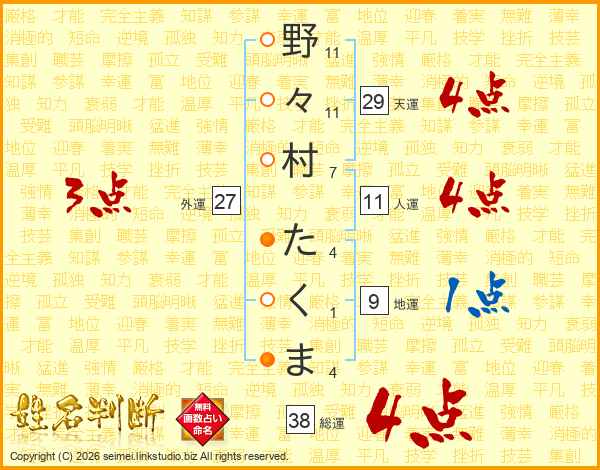 野々村たくまさんの総運は38画の4点!