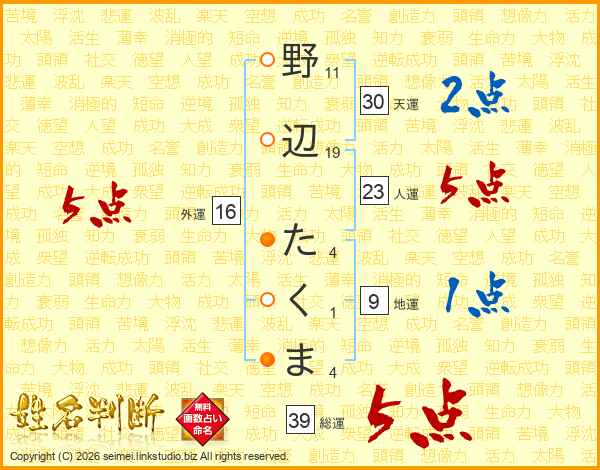 野辺たくまさんの人運は23画の5点!