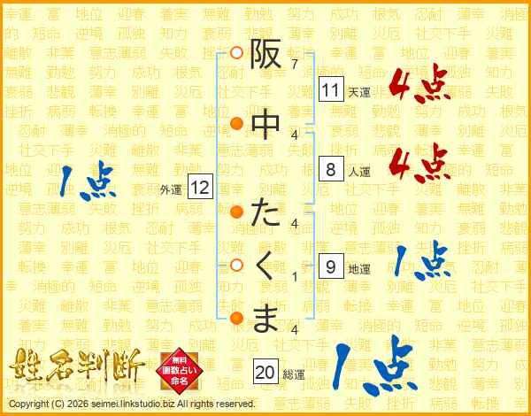 阪(7画)中(4画) た(4画)く(1画)ま(4画)