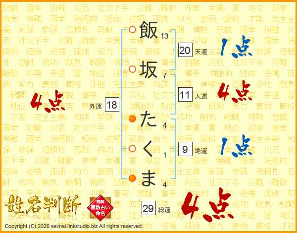 飯坂たくまさんの総運は29画の4点!