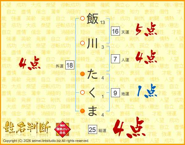 飯(13画)川(3画) た(4画)く(1画)ま(4画)