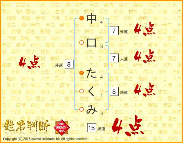 中(4画)口(3画) た(4画)く(1画)み(3画)