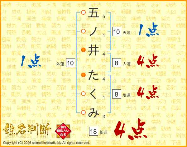 生活面を象徴する運勢です。外部から受ける影響力を表し、結婚運、家庭運や職場、環境への順応性を表します。総運から人運を引いた画数。姓や名が1文字の場合を除く。