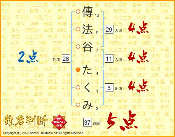 傳法谷たくみさんの総運は37画の5点!