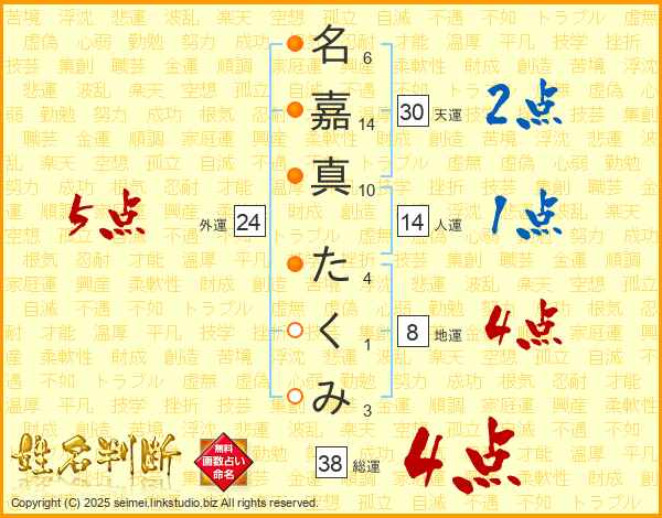 名(6画)嘉(14画)真(10画) た(4画)く(1画)み(3画)