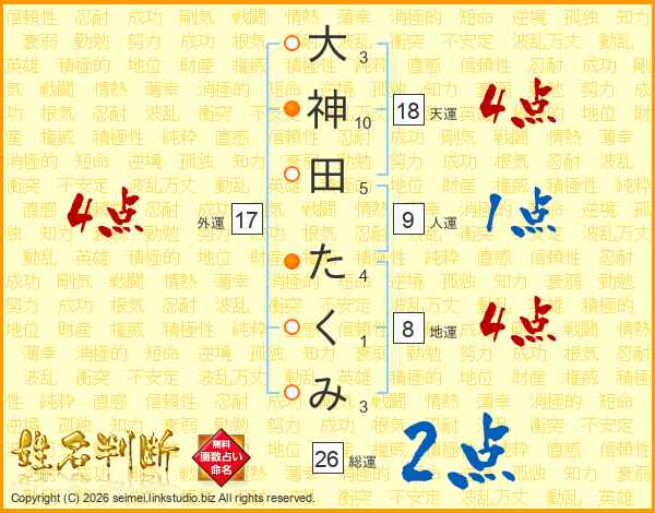大神田たくみさんの総運は26画の2点!