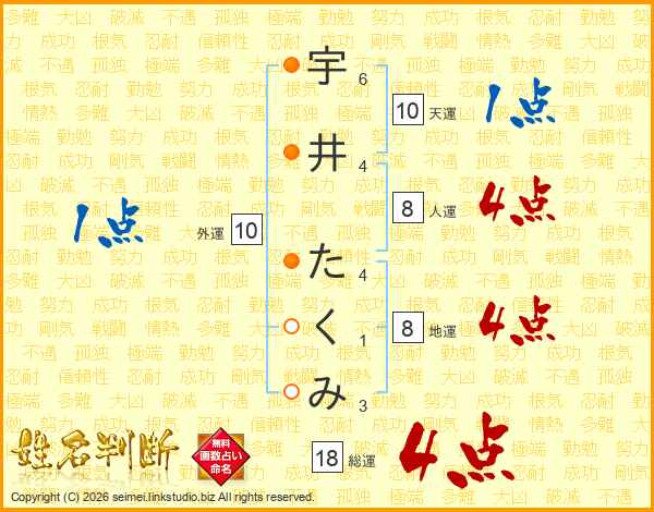 宇井たくみさんの総運は18画の4点!