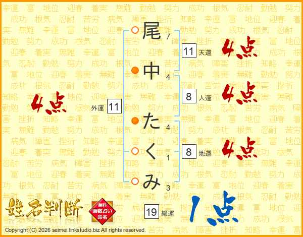 尾(7画)中(4画) た(4画)く(1画)み(3画)