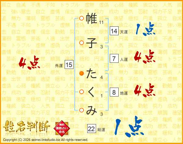 帷(11画)子(3画) た(4画)く(1画)み(3画)