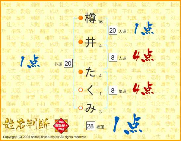 樽井たくみさんの総運は28画の1点!