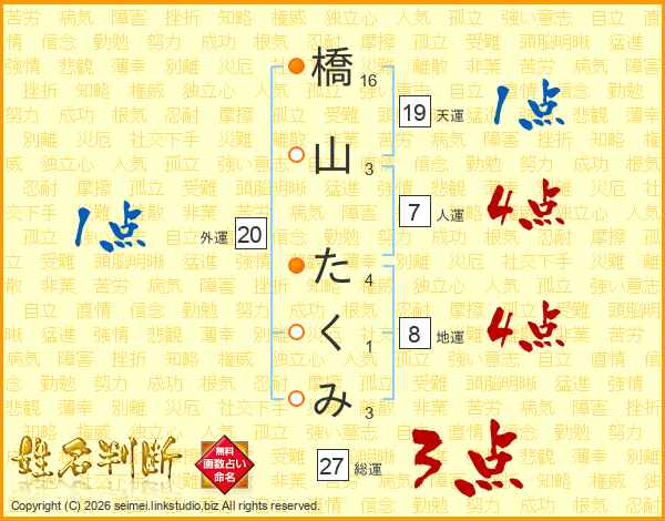 あなたの人生を表す1番重要な運勢です。生涯を通じて影響する総合運となり、主に50歳以降の晩年期に影響を及ぼします。苗字と名前の合計画数。