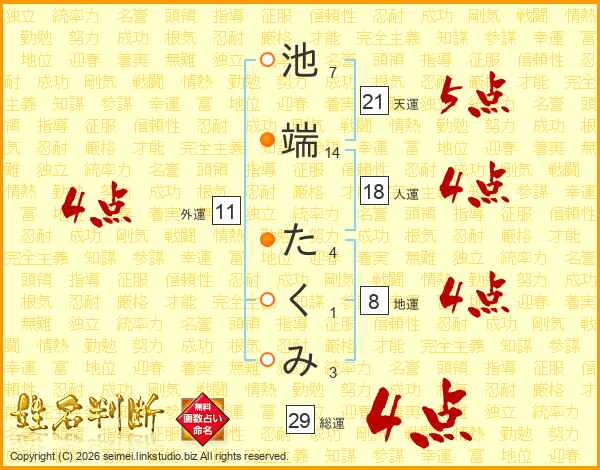 池端たくみさんの総運は29画の4点!