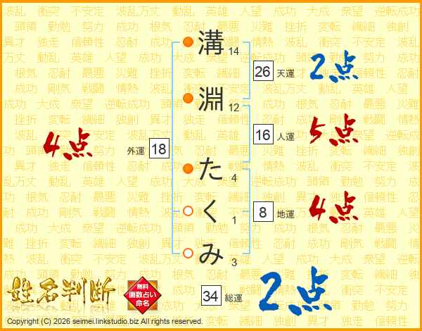 溝(14画)淵(12画) た(4画)く(1画)み(3画)