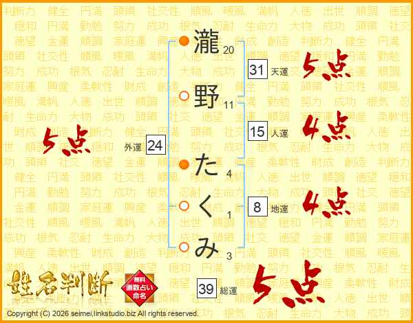 瀧(20画)野(11画) た(4画)く(1画)み(3画)