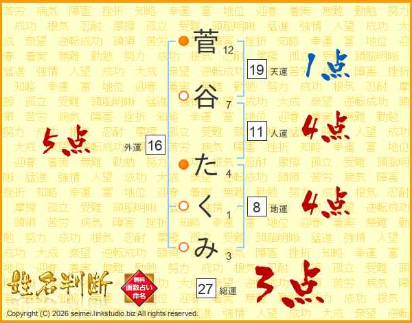菅谷たくみさんの総運は27画の3点!