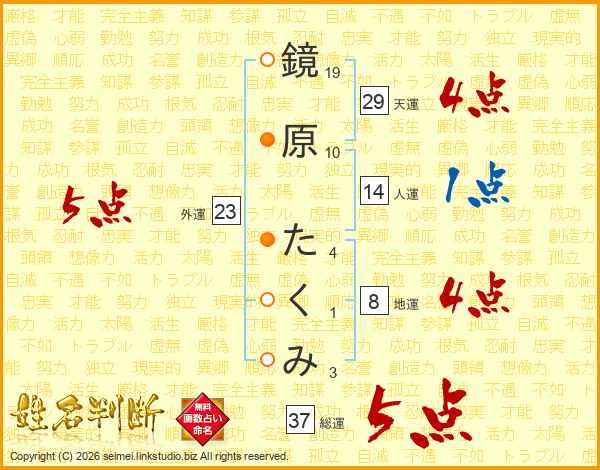 鏡(19画)原(10画) た(4画)く(1画)み(3画)