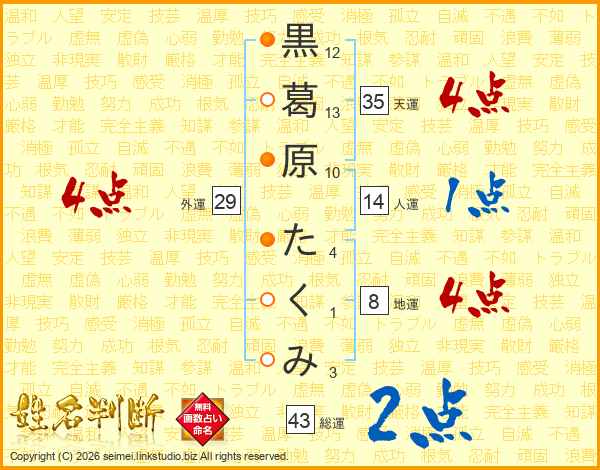 黒(12画)葛(13画)原(10画) た(4画)く(1画)み(3画)