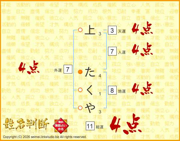 家系が持つ宿命的な運勢を表します。祖先から受け継いだ苗字ですので自分の力が及びません。家柄を象徴します。苗字の合計画数。