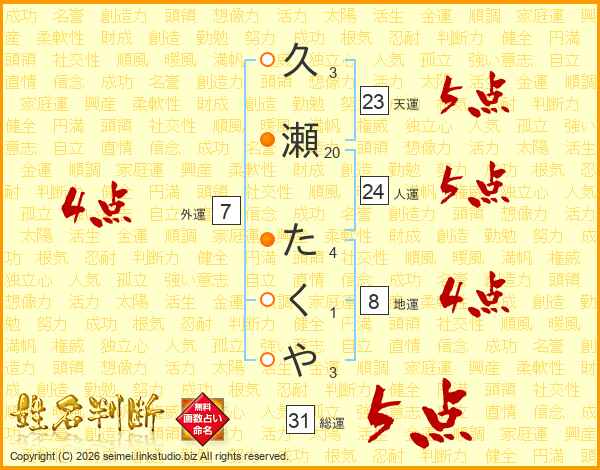 久瀬たくやさんの総運は31画の5点!