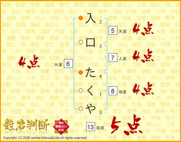 入口たくやさんの総運は13画の5点!