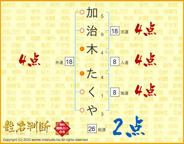 加(5画)治(9画)木(4画) た(4画)く(1画)や(3画)