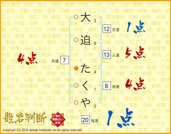 大(3画)迫(9画) た(4画)く(1画)や(3画)