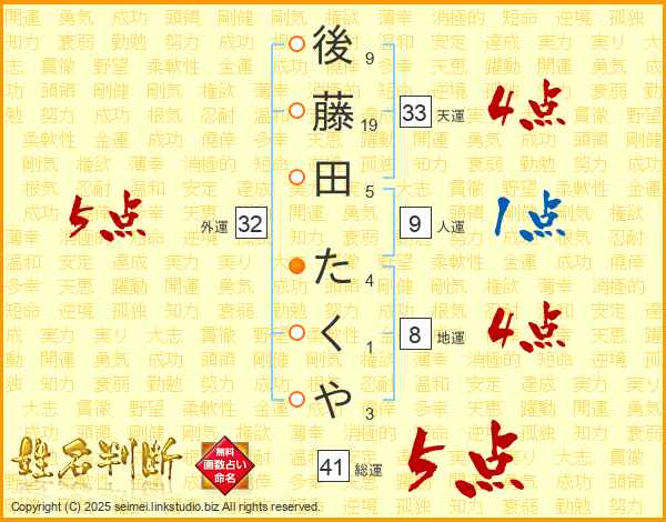 後(9画)藤(19画)田(5画) た(4画)く(1画)や(3画)