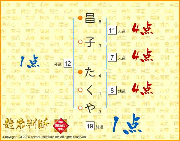 昌(8画)子(3画) た(4画)く(1画)や(3画)