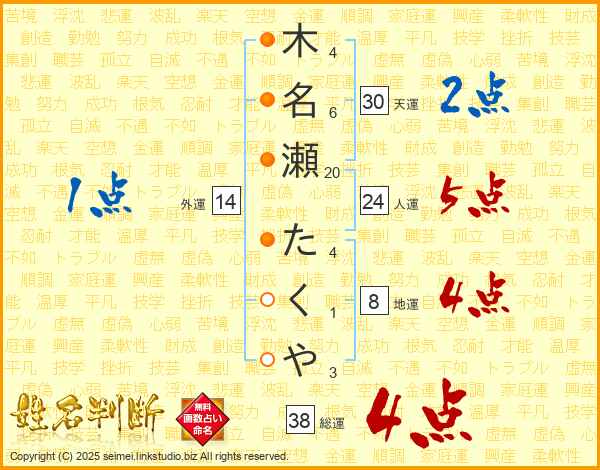 木(4画)名(6画)瀬(20画) た(4画)く(1画)や(3画)