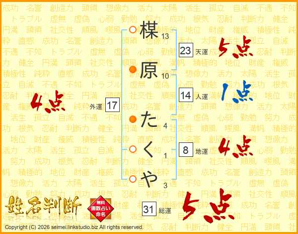 楳原たくやさんの総運は31画の5点!
