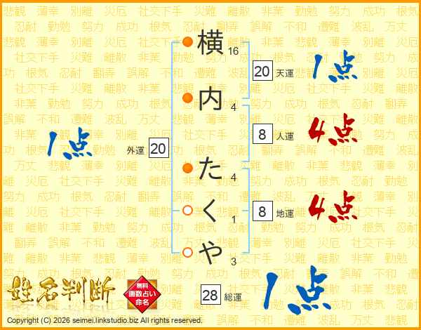 横内たくやさんの総運は28画の1点!