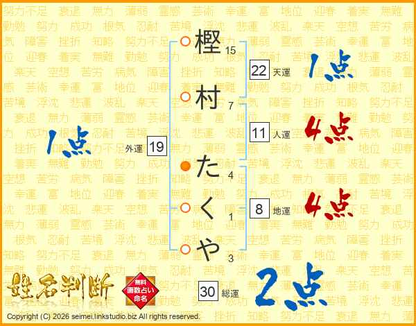 樫村たくやさんの人運は11画の4点!